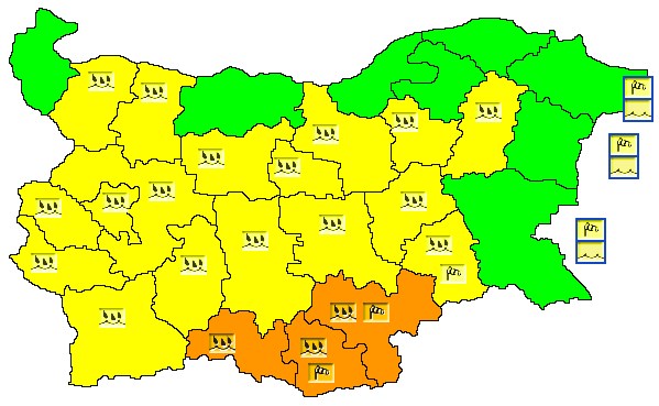 Почти в цялата страна е обявен жълт код за опасни валежи, а на места и за силен вятър