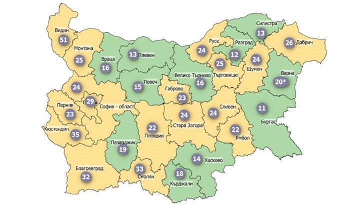 Все още в жълто са 17 области. Най-много заразени на 100 000 души има във Видинска област - 51, следват я Кюстендилска с 35, Смолянска - 33 и Благоевградска - 32 на 100 000.