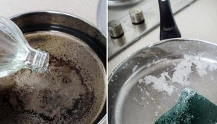 Покрийте съда с вода. Изсипете вътре и чаена чаша бял оцет, след това сложете на котлона и изчакайте течността да заври. Добавете 2 супени лъжици сода за хляб, изпразнете тигана и ще можете без затруднения да го изтъркате.