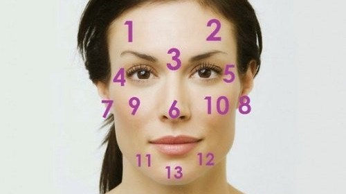 Ако не е менструален цикъл или фактори, причиняващи появата на пъпки или петна, тогава трябва да се обърне сериозно внимание на други възможни причини. По-долу представяме 14 зони на лицето, които отразяват това, което се случва в тялото, пише zdraveikrasota. Вижте зоните, отбелязани с номера, и съответните проблеми.