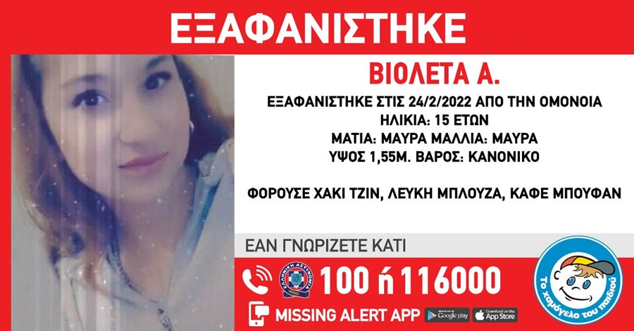 На 24.02.2022 г. от района на площад Омония в гръцката столица изчезна 15-годишната Виолета А., съобщават от организацията "Усмивка на детето", пише Труд.