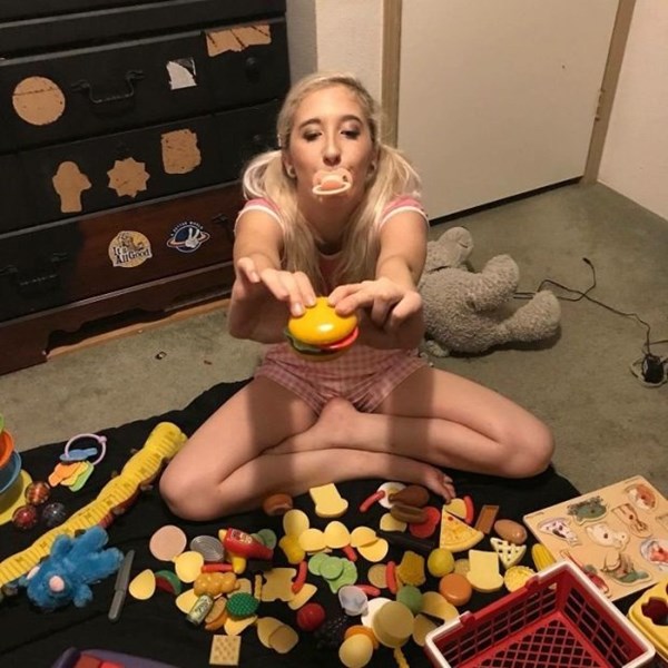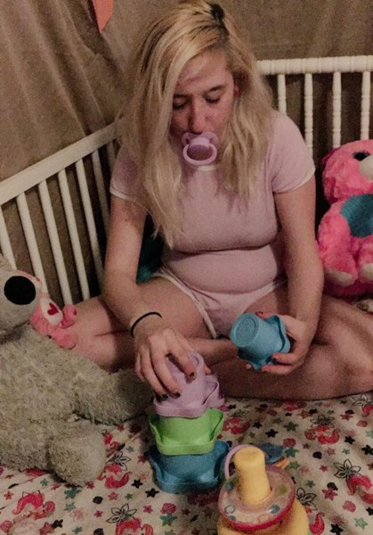 18-годишната Тори Харт пие мляко от бебешко шише, смуче биберон, носи памперси и гука като бебе.