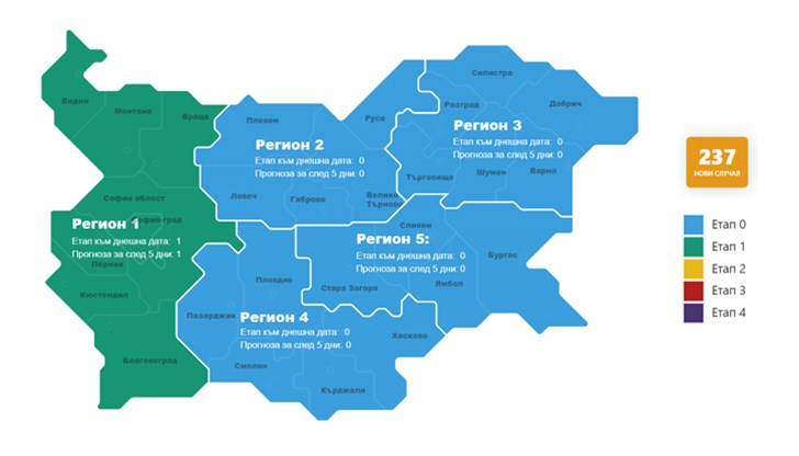 Разпределението по области по настоящ адрес на новооткритите с положителна проба е: Благоевград – 10; Бургас – 11; Варна – 12; Велико Търново – 2; Видин – 4; Враца – 11; Габрово – 1; Добрич – 8; Кърджали – 2; Кюстендил – 0; Ловеч – 2; Монтана – 0; Пазарджик – 6; Перник – 4; Плевен – 4; Пловдив – 11; Разград – 0; Русе – 4; Силистра – 8; Сливен – 3; Смолян – 3; София област – 14; София град – 91; Стара Загора – 18; Търговище – 2; Хасково – 3; Шумен – 3; Ямбол – 0.