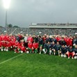 Двата отбора направиха почетна обиколка пред хората от трибуните, които не се побояха от пороя.