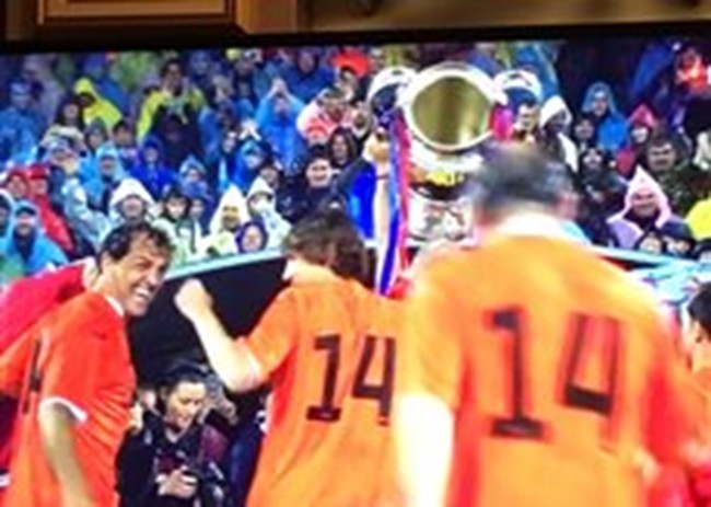 В 14-ата минута пък играта бе прекъсната в памет на великия Йохан Кройф, а внукът на Летящия холандец получи фланелка от юбиляра.