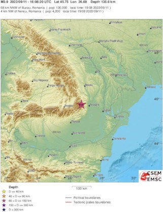 Трусът е с дълбочина 170 км на 45.69 северна ширина и 26.70 източна дължина.
