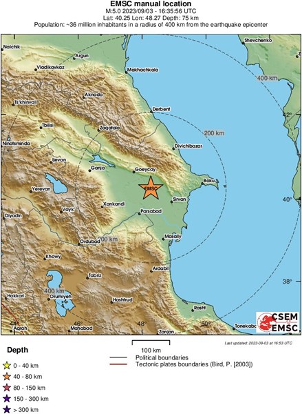 Епицентърът е бил на дълбочина 18 км и на 29 км северозападно от град Аджикабул, с население от 23,1 хиляди души, съобщи Европейско-средиземноморският сеизмологичен център.
