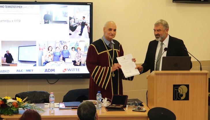 Ректорът на университета, професор доктор Генчо Попов, възпитаник на факултета, връчи плакет за изключителен принос към развитието на Русенския университет на декана доцент доктор инженер Димитър Димитров. Факултетът получи и ваучер за компютърна система.