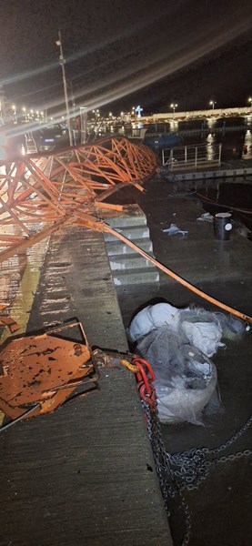 Тежката конструкция е паднала върху територията на новото рибарско пристанище, затискайки четири лодки. Повредени са също част от оградата, понтона и осветително тяло. Въпреки сериозните материални щети, най-важното е, че при инцидента не са пострадали хора.