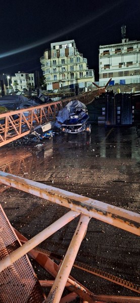 Силна буря връхлетя Поморие снощи, причинявайки сериозни материални щети в района на рибарското пристанище. Около 21:00 часа 50-метров строителен кран, разположен на строителната площадка на хотел „Поморие", рухна под напора на ураганния вятър.