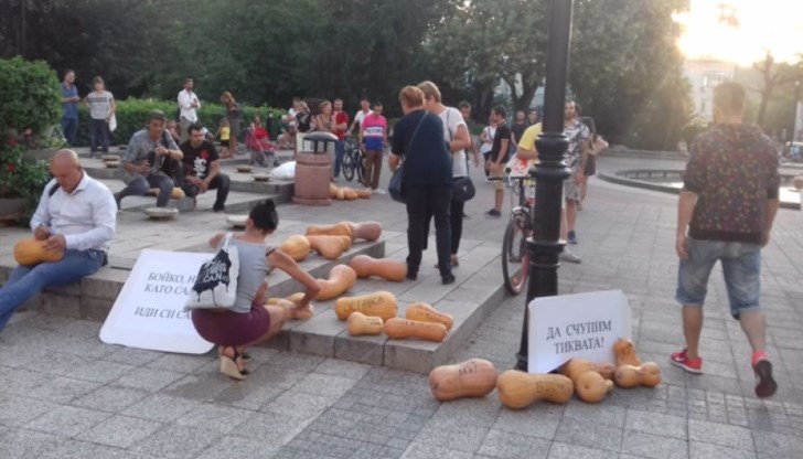 С тикви на площад „Стефан Стамболов“ след 18 часа започнаха антиправителствените демонстрации в Пловдив тази вечер. С маркери протестиращите надписват предварително донесени тикви.