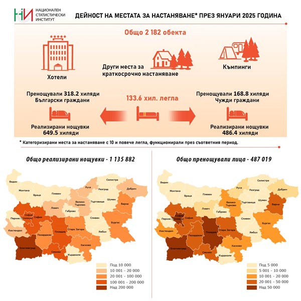 Значителен е ръстът в броя на пренощувалите лица, който достига 487 хиляди души, или с 12,7% повече спрямо януари 2024 г. Чуждестранните туристи са се увеличили с 19,5%, а българските - с 9,4%. От данните става ясно, че българските граждани, общо 318,2 хиляди, са реализирали средно по 2 нощувки, докато чуждите граждани, наброяващи 168,8 хиляди, са отсядали за по-дълго време - средно по 2,9 нощувки.