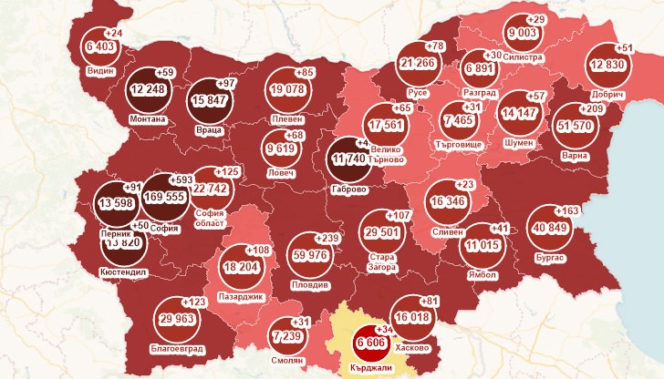 Разпределението на потвърдените нови случаи по области по настоящ адрес е, както следва: Благоевград - 123; Бургас - 163; Варна - 209; Велико Търново - 65; Видин - 24; Враца - 97; Габрово - 45; Добрич - 51; Кърджали - 34; Кюстендил - 50; Ловеч - 68; Монтана - 59; Пазарджик - 108; Перник - 91; Плевен - 85; Пловдив - 239; Разград - 30; Русе - 78; Силистра - 29; Сливен - 23; Смолян - 31; София област - 125; София град - 593; Стара Загора - 107; Търговище - 31; Хасково - 81; Шумен - 57; Ямбол - 41.