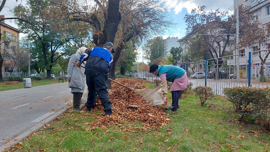 Тези дни активно се събира окапалата листна маса от алеи, улици и тротоари в града