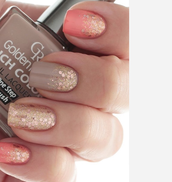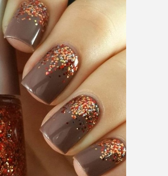 Земните цветове и златният глитер са акцентът в есенния маникюр. Винаги може да украсите кафявото с глитер, за да направите маникюра особено ефектен.