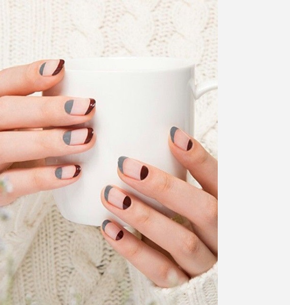 Интересна идея, която може да направите по два начина – или да лакирате средната част от нокътя в нюд цвят, или да я оставите без лак според горещата тенденция.