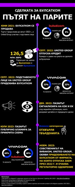 Обявеното на 9.11.2023 г. намерение от собственика на United Group за придобиване на Булсатком официално потвърждава схемата, за която А1 и други пазарни играчи сигнализираха още в края на миналата година. Тогава предупредихме публично, че Виваком ще се опита да погълне Булсатком от настоящия му собственик, който го е купил със заем от United Group.