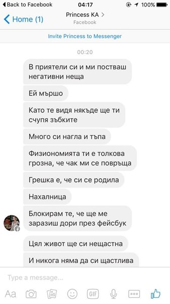 "В приятели си ми и постваш негативни неща. Ей, мършо, като те видя някъде, ще ти счупя зъбките", пише "деликатната" Каролина Клер.