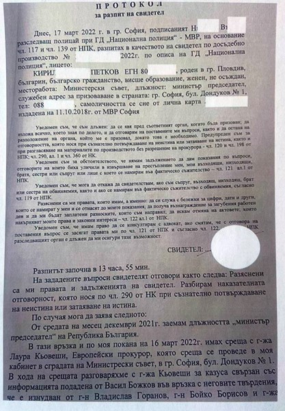 Сайтът "Афера" публикува протокол от разпита на премиера Кирил Петков, чиито показания послужиха за ареста на бившия премиер Бойко Борисов