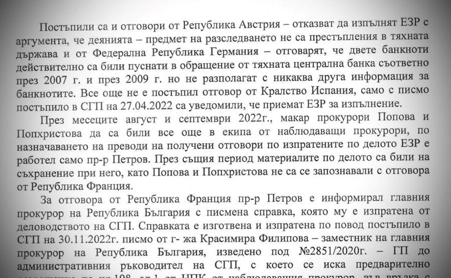 2. Този факт обаче не е оповестяван публично досега от ръководството на прокуратурата, макар тя да е коментирала делото, включително с цитираната медийна изява на нейния ръководител, в която изрично се споделя само за отговора, в който се говори за несъществуваща банкнота. От постановлението на СГП така и не става ясно дали отговорът от Германия също е бил постъпил по това време или по времето, когато наблюдаващият прокурор е информирал изрично със справка Гешев за отговора от Франция.