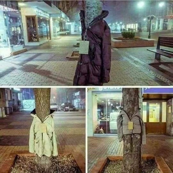 Хора оставят зимни якета в различни градове в помощ на нуждаещи се от топли дрехи през студените месеци. Инициативата стартира в София и съседна Турция като у нас много хора оставят зимни якета и палта по дърветата на бул. "Витошка", пише България днес".