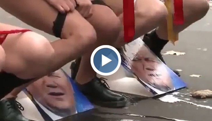 Активистки от Фемен публично уринираха върху портрета на Янукович в Париж