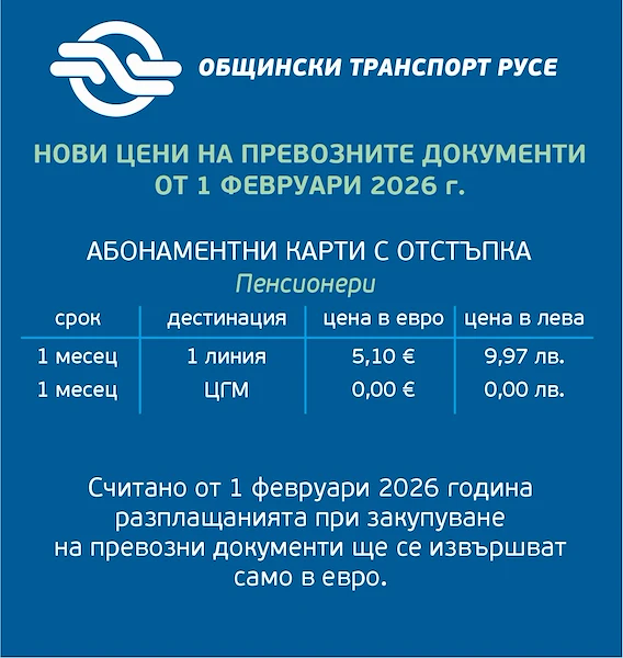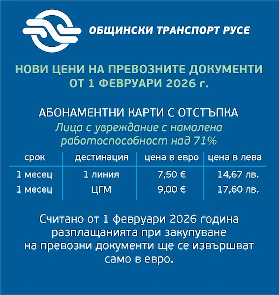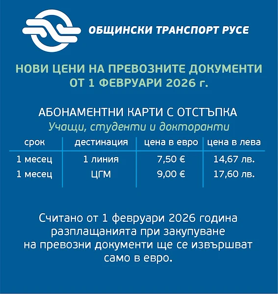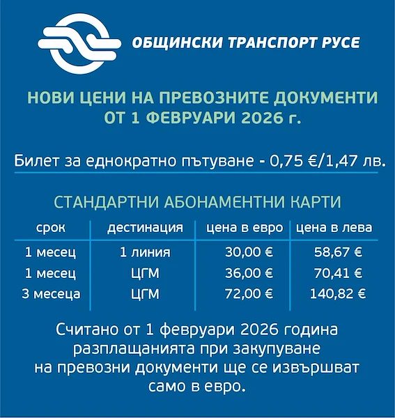 Считано от 1 февруари 2026 година, „Общински Транспорт Русе“ ЕАД въвежда нови цени за пътуване с автобуси и тролейбуси, като разплащанията ще се извършват единствено в евро. Решението идва след месец на преходен период и технически трудности при първоначалното въвеждане на новата валута в началото на годината.