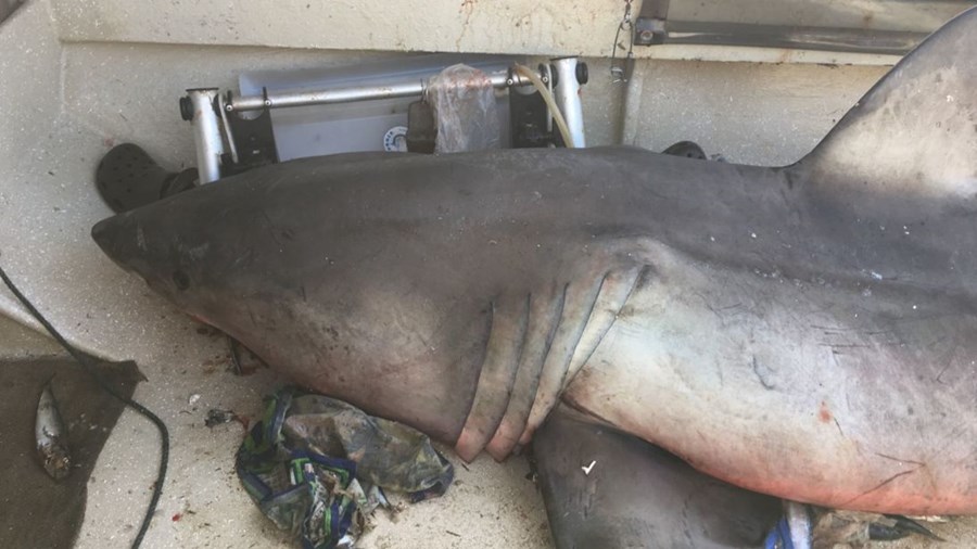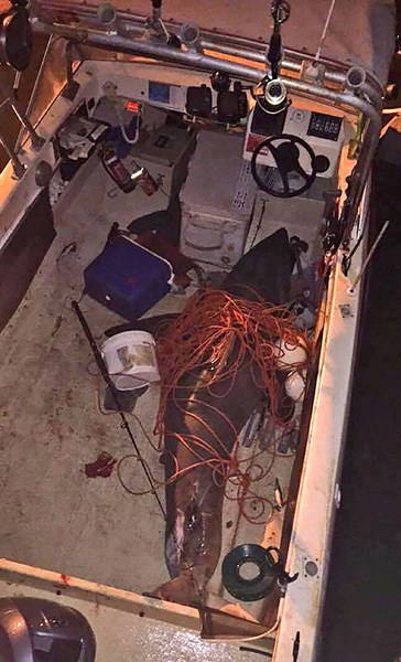 „Акулата прелетя над мотора и падна в лодката”, уточни рибарят. Хищникът е бил 2,7 м. дълъг, а лодката – 4,5 метра. Човекът, на четири крака и оказалата се на сухо акула се гледали втренчено известно време, после пришълецът започнал да се върти и да се тресе.