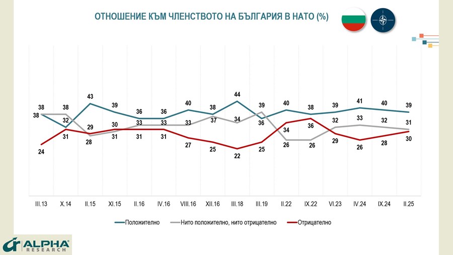 Новите геополитически реалности и несигурността около бъдещето на евроатлантическия съюз оказват по-осезаемо влияние върху обществените нагласи спрямо НАТО. Социолозите отбелязват леко стесняване на разликата между позитивните и негативните оценки за членството на България в Алианса – от 40%:28% през септември миналата година до 39%:30% през февруари 2025 година.