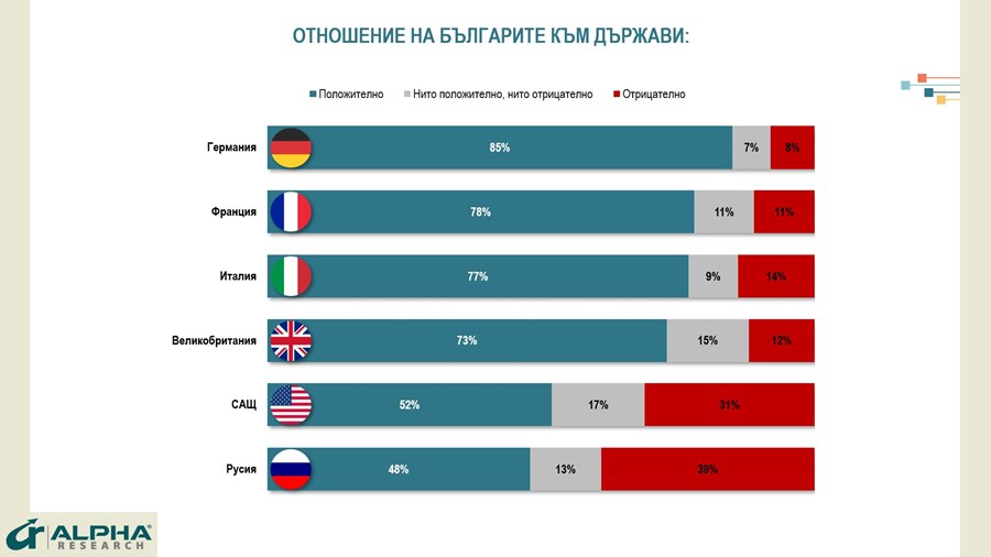 Проучването отчита високи нива на доверие към европейските държави, които полагат усилия за отстояване на общоевропейските позиции и постигане на траен мир в Украйна. Германия се ползва с 85% доверие сред българите, Франция – 78%, Италия – 77%, Великобритания – 73%. Положително отношение към САЩ декларират 52%, а към Русия – 48% от пълнолетните жители на страната.