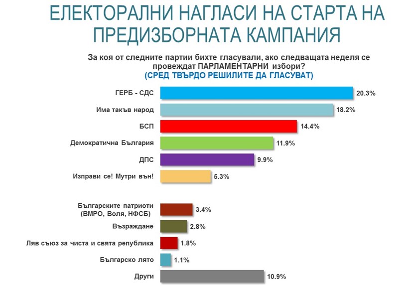 20.3% за ГЕРБ-СДС с минимална преднина от 2% пред "Има такъв народ" на Слави Трифонов, която е с 18.2%.