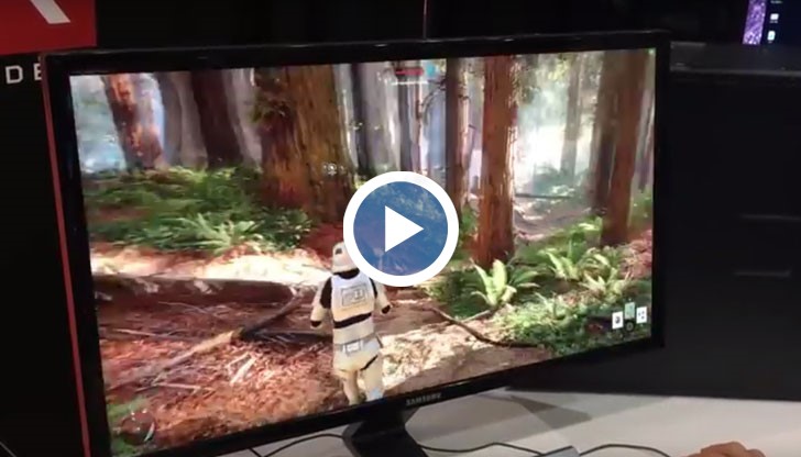 Демонстрацията на осемядрения процесор RYZEN с честота 3.4 GHz и новия графичен ускорител Vega с още неназовани характеристики изстрелва Star Wars Battlefront с ултра настройки в 4К резолюция.