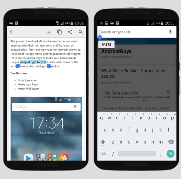 Идеята на компанията е смартфоните с Android да предложат още по-бърз и лесен начин за маркиране и копиране на текст. Новата функция се казва "Copyless Paste" и позволява да поставяме дадена дума или изречение без да се налага да ги копираме предварително. За целта Google разработват усъвършенствани алгоритми, които предвиждат какво искате да копирате и го правят вместо вас, сподели digital.bg.
