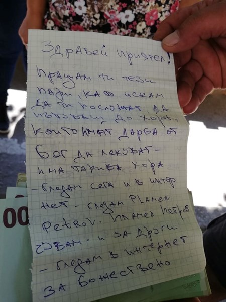Благодетелят е оставил и писмено послание, в което приканва Добри, който е диагностициран с остра лимфобластна левкемия, да се моли с вяра в сърцето си за своето спасение, съобщиха организаторите на базара.