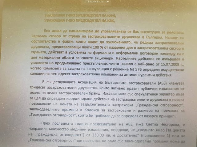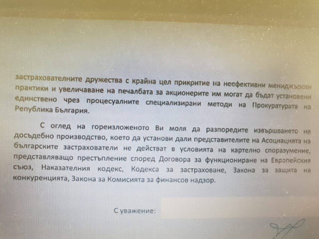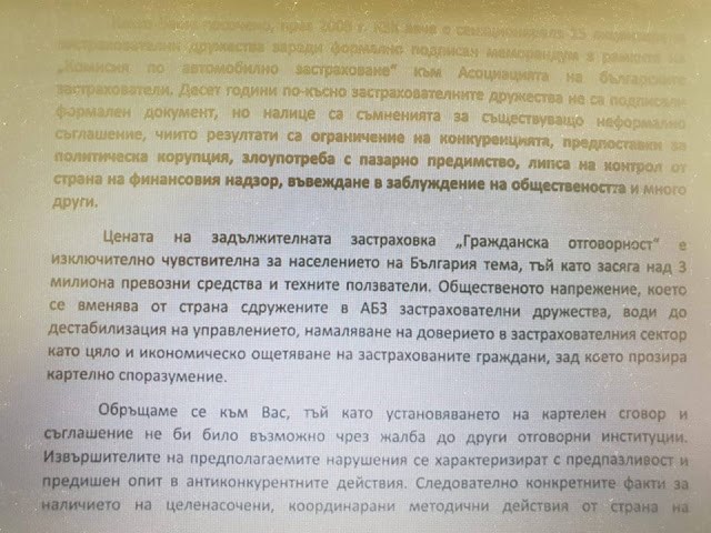 Сигналът е внесен в деловодството на прокуратурата на 27 декември 2018 г. и в него се отбелязва, че изказвания на представители на Асоциацията на българските застрахователи (АБЗ) в публичното пространство водят до заключението, че застрахователните дружества действат в условията на неформални уговорки помежду си. Целта им е координирано повишаване на цената на задължителната „Гражданска отговорност“ без да има реални пазарни или други основания за това поскъпване.