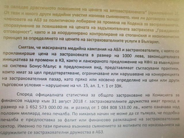 Като примери се изтъкват изказвания на председателя на АБЗ Светла Несторова, в които, от името на всички членове-застрахователи, се иска драстично повишаване на застраховката на 1000 лв. годишно. Припомня се, че промените в Кодекса за застраховане от есента на тази година, както и системата "Бонус-Малус", са предложени като съгласувани практики от страна на застрахователите и целят ограничаване на конкуренцията на пазара. Сами по себе си тези предложения от фирмите са нарушение на Закона за защита на конкуренцията, Кодекса за застраховане, Закона за КФН и европейски директиви.В сигнала се припомня, че през 2008 г. КФН веднъж вече е санкционирала за картел застрахователните дружества. Според анонимните вносители на сигнала действията на АЗП в момента водят до съмнения за политическа корупция, ограничение на конкуренцията и дезинформиране на обществото с цел повишаването на печалбата на застрахователите. Като аргумент се изтъква фактът, че застрахователните дружества са формирали над 500 милиона лева печалба за 2018 г., което превръща в неоснователни твърденията, че ще има фалити на застрахователи.