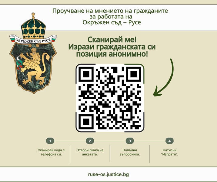 Анкетата е достъпна по два начина - чрез сканиране на QR код с мобилен телефон или чрез посещение на официалния сайт ruse-os.justice.bg в секция "Обратна връзка - Анкети".
