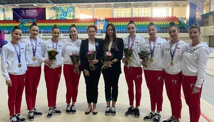 Вчера възпитаничките на Весела Димитрова и Михаела Маевска бяха оценени с 26.400 точки на пет обръча. Така с две най-силни оценки ансамбълът на България спечели шампионската титла със сбор от 53.950 точки.