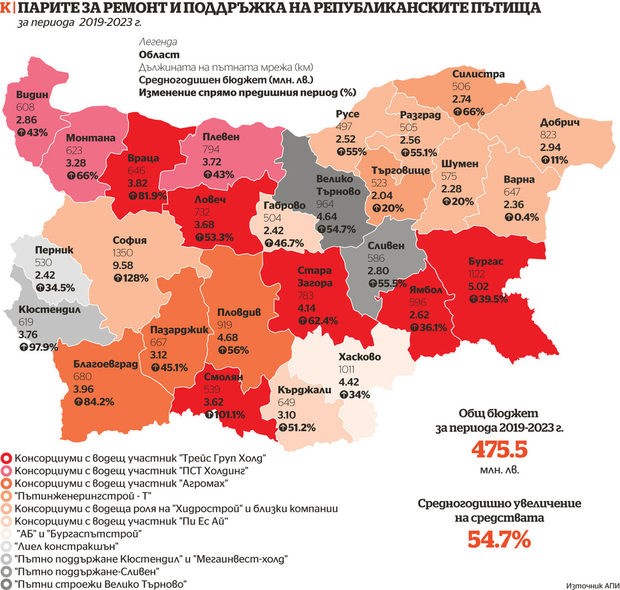 Договорите за поддържане по районите досега бяха за четири години, като са сключени между 2014 и 2016 г., показва справка в сайта на пътната агенция. Поръчките бяха разделени на областни пътни управления, като някои от тях изтекоха в края на 2018 г. Заради липсата на нови договори за поддържане обаче АПИ е удължила срока на търговете за някои от 48 на 54 месеца - например в Кърджали, Хасково, Смолян, Кюстендил, Русе, Ямбол, Стара Загора. Така някои строители ще получат автоматично допълнителни средства и през 2019 г. в зависимост от задачите, които им бъдат поставени.