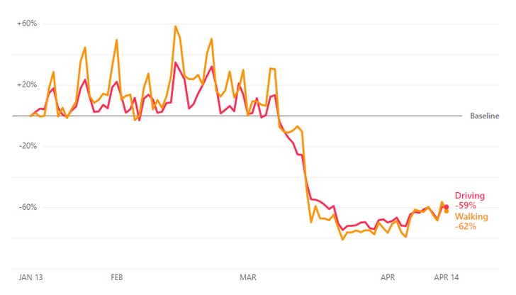 На адрес https://www.apple.com/covid19/mobility можете да изберете съответната държава и да видите как е намаляло движението - на пешеходци и на коли, през последните месеци.