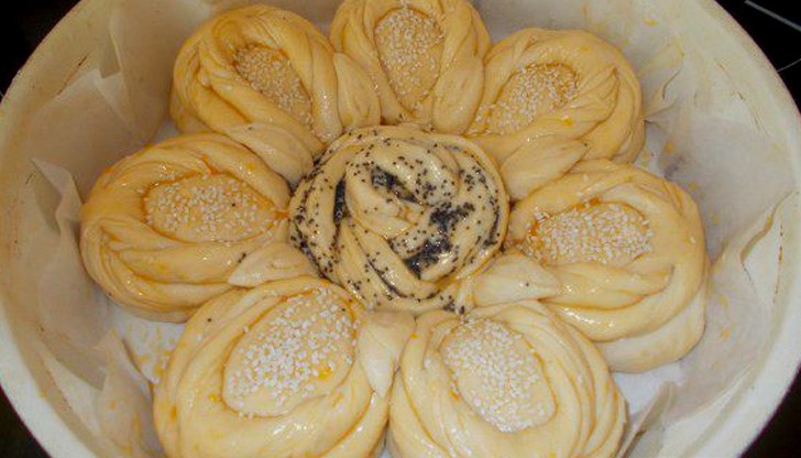 Двете връхчета се промушват един или два пъти през разреза и се изтегля отдолу-нагоре. Всяко оформено листенце се поставя върху всяка топка. Останалото тесто се разточва на правоъгълник, намазва се с масло и поръсваме с маково семе. Навива се руло, срязва се през средата на две и се усуква като роза.