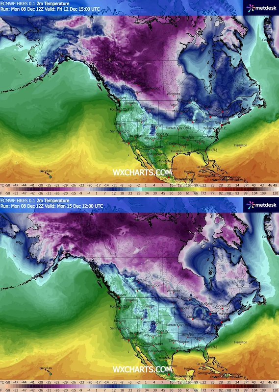 Разрушаването на полярния вихър над Северна Америка активира така наречения метеорологичен модел "Полярен експрес". Според прогнозите на NOAA и водещи метеорологични модели, към предстоящия уикенд (14-15 декември) огромни маси леден въздух ще се спуснат от Арктика към Аляска, Канада и големи части от САЩ.