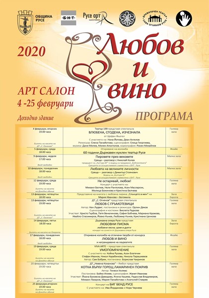 През целия месец февруари ще се представят пред русенската публика събития, посветени на двата традиционни празника: Деня на виното и Деня на любовта. Партньори в тази инициатива са: ДТ „Сава Огнянов“, Държавна опера – Русе, Държавен куклен театър –Русе, БНТ – Регионален център – Русе и Дружеството на русенските художници, съобщиха от общинската управа в крайдунавския град.