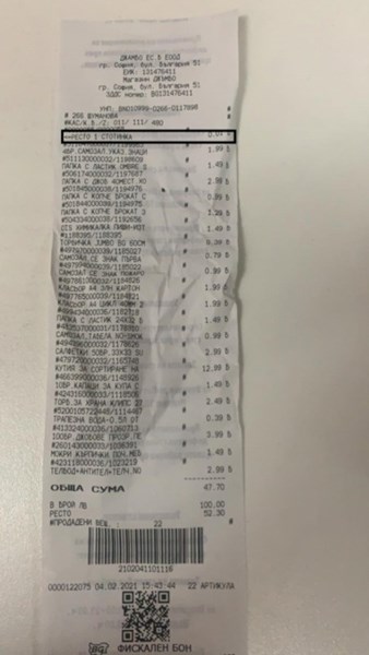 На касова бележка, но от друг магазин на веригата, подобен артикул не фигурира. Явно само в обекта, от който е пазарувала младата жена, има подобна практика.
