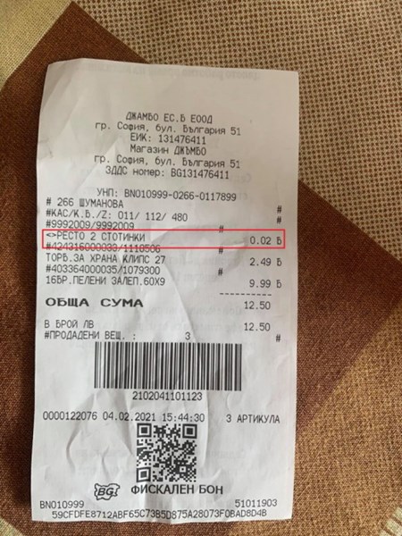 Артикул "ресто" в касов бон озадачи клиентка на "Джъмбо"