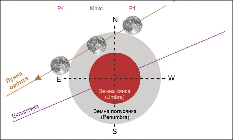 Преминаването на Луната през земната полусянка на 25 март. Моментите Р1 и Р4 са на първия и на последния контакт на Луната с полусянката (penumbra). Затъмнението ще се случи преди преминаването на Луната през низходящия възел на нейната орбита. Илюстрация: Пенчо Маркишки