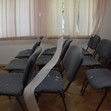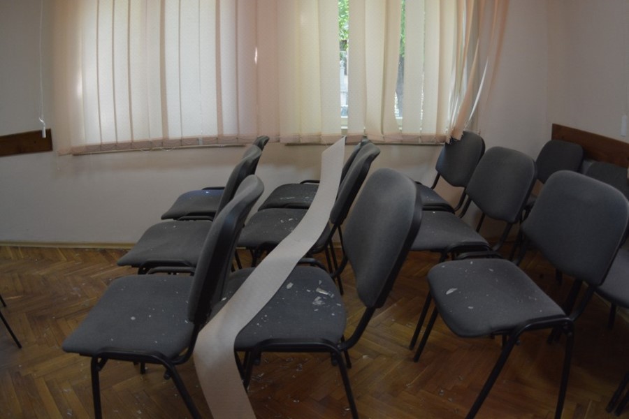 Отпечатъци от каменните късове има и по стената на заседателната зала, която е осеяна със стъкла. За инцидента са уведомени органите на реда.