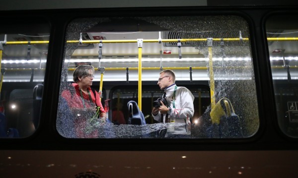 Автобус, който превозваше журналисти между две съоръжения на олимпийските игри в Рио де Жанейро, стана жертва на нападение.
