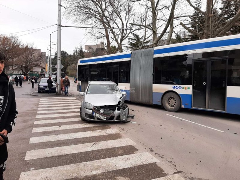 Инцидентът става на метри от оживена спирка. Към момента районът е блокиран, очакват се големи закъснения на автобусите. Все още не е дошъл екип на полицията. Шофьорът на автобуса обясни за БНТ, че е отклонил към спирката, за да не удари колата-нарушител, предаде БНТ.