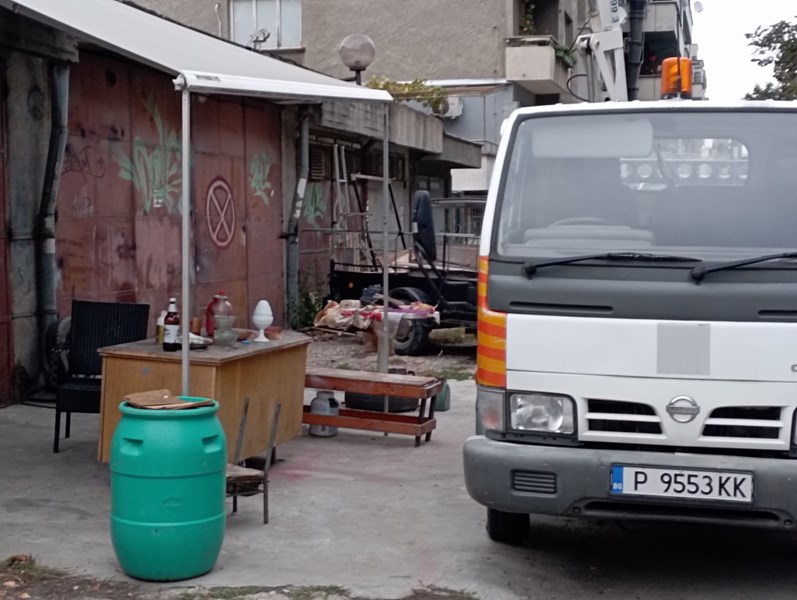 Има поставени маси и пейки на тротоара. Същият човек ползва целият квартал да си паркира коли без номера бусове, лодки, вишки и ремаркета.